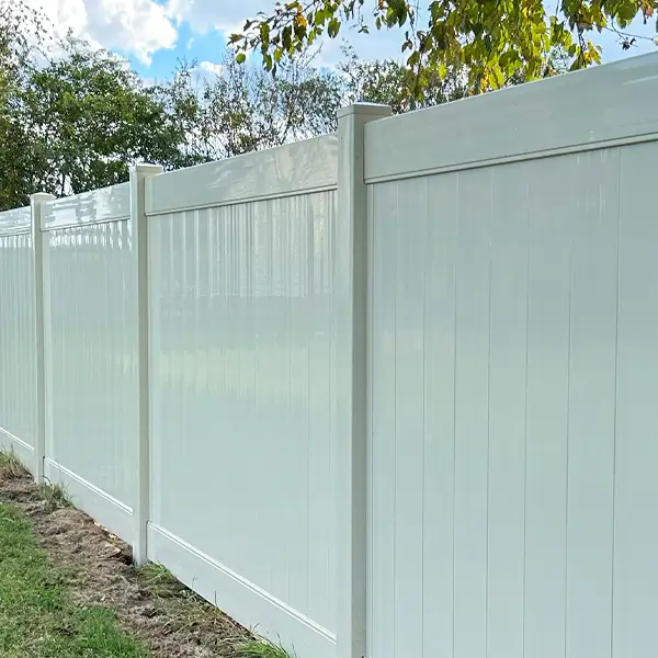Solid vinyl panels provide complete privacy from the ground to the top rail. The smooth surface resists dirt and washes clean with water. Panels interlock with posts to prevent gaps and maintain straight fence lines.