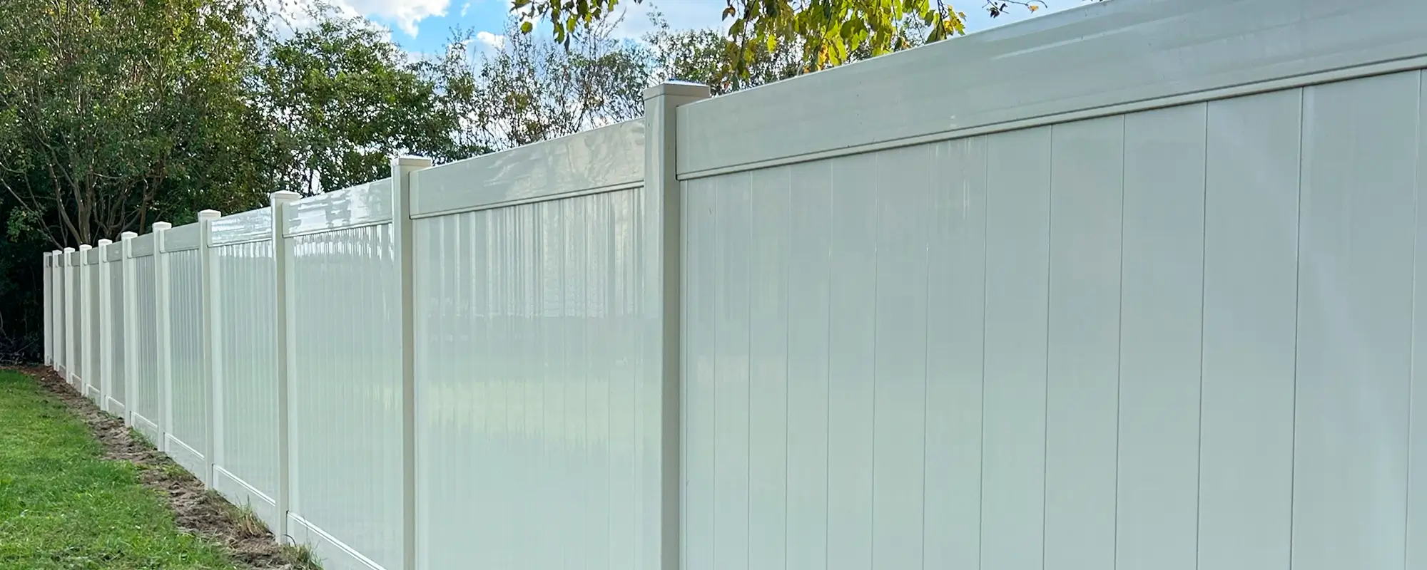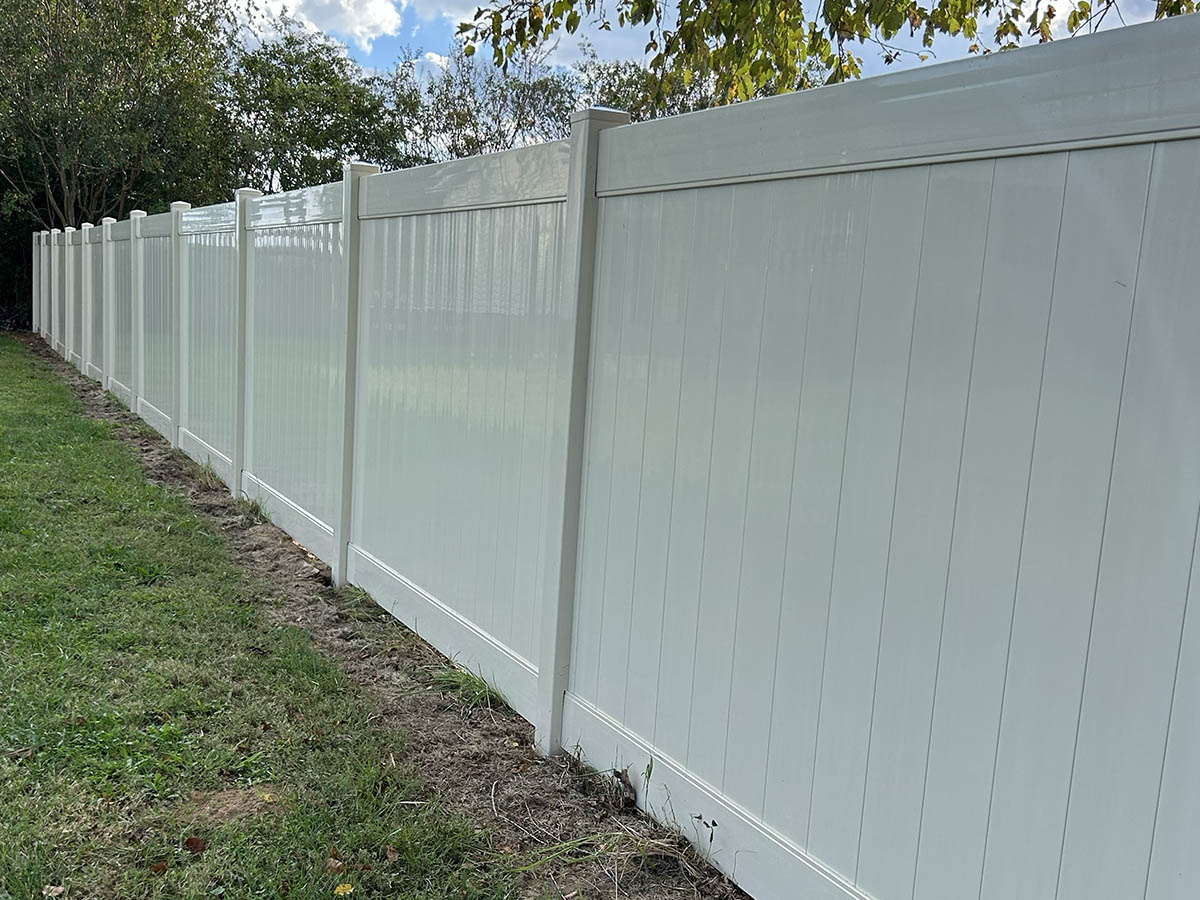 We install standard vinyl privacy fences, with white being our most popular option. We fully stock our vinyl privacy panels in white, almond, and grey, and we can customize your fence with any type of post caps you prefer.
